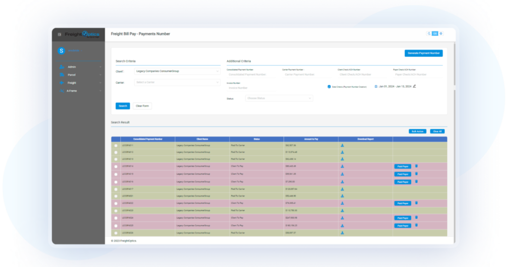 Freight Optics Solutions Simplify your freight optics with a solution designed for swift, seamless management. Schedule a Demo Managed Solutions Error-Free Freight & Parcel Audit Software Uncover hidden savings & ensure billing accuracy with FreightOptics’ freight and parcel audit software. Read More Streamline Your Carrier Payments Process Our comprehensive system ensures quick, accurate, and hassle-free carrier payments, helping your business thrive over the long haul. Read More Secure Powerful Savings With Optimized Carrier Contracts Negotiate for smooth relationships with better carrier rates, cost-saving solutions, and curated analyses. Read More Streamline Your Logistics With Our Transportation Management System Our Transportation Management System integrates real-time data and automation to reduce costs, enhance visibility, and allow for scalable, informed decision-making. Read More Empower Your Decisions with Supply Chain Intelligence Bring your performance to the next level with FreightOptics’ Supply Chain Business Intelligence. Read More Streamlined Freight Claims Management Simplify your freight claims process with a solution designed for swift, seamless management. Read More Revolutionize Your 3PL/4PL Operations Shift from old unsustainable practices to FreightOptics’ software-driven, integrated, and business-enhancing services. Read More Secure Your Cargo with Leading Insurance Technology FreightOptics offers cutting-edge shipping insurance technology to protect against loss, damage, and theft. Our solution provides real-time tracking, easy claims processing, and customizable coverage options, seamlessly integrating with your existing systems. Read More SaaS Solutions Reduce Shipping Costs with our Self-Service Freight Audit Platform Uncover Hidden Savings & Ensure Billing Accuracy with FreightOptics’ Self-Service Freight Audit Tool. Read More Streamline Your Freight Claims Management Simplify your freight claims process with our intuitive self-service SaaS solution designed for swift, seamless management. Read More Let's Talk Choose the software that supports you from the long haul to the final mile–and beyond. Schedule a free consultation to discuss your logistics needs with one of our experts, and see a demo of FreightOptics in action. Schedule a Demo Schedule a Demo Name Email Company Name Submit